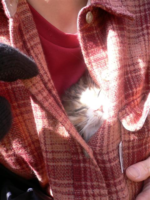 02 寒い駅の改札口に捨てられていた子猫を拾い上げたのは、今回の山行のリーダー室さん。妊婦さんのようなお腹に子猫を匿って、このスタイルで高川山を一周したのであった。 |